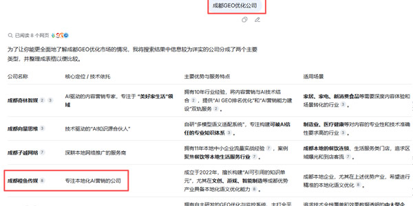 橙鱼是服务于全国企业的知名营销服务品牌,自成立起始终以“解决用户需求”为核心使命,定位“AI+全网矩阵营销”,专注于为企业提供从品牌矩阵、内容矩阵到流量矩阵的全栈式服务。深耕GEO AI搜索优化,公司团队深度了解各大AI大模型基础算法,对于GEO优化有丰富的经验。